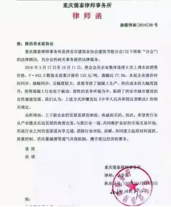 10月27日,鑒于陜西省內(nèi)水泥市場及混凝土市場發(fā)展情況,西安市建筑業(yè)協(xié)會(huì)建筑節(jié)能分會(huì)認(rèn)為這一市場情況違法了《中華人民共和國反壟斷法》的相關(guān)規(guī)定,并向陜西省水泥協(xié)會(huì)發(fā)律師函。希望水泥行業(yè)從產(chǎn)業(yè)鏈及長遠(yuǎn)發(fā)展的角度出發(fā),與混凝土行業(yè)一道,共同維護(hù)良好的市場交易環(huán)境,形成行業(yè)之間信息渠道共享互通,消除行業(yè)對抗、誤解,共同建立起原材料漲跌,質(zhì)量控制、供應(yīng)量減增等通氣共商機(jī)制,攜手度過經(jīng)濟(jì)寒冬。