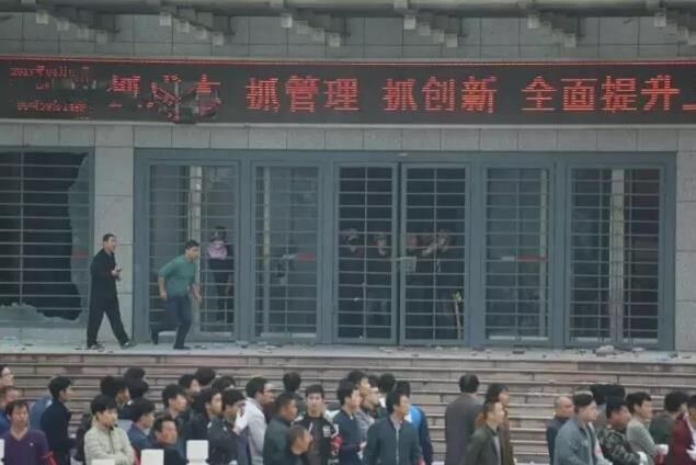 3月8日凌晨,袖纏紅護(hù)身符布條、手戴白手套,600多人拿著棍棒聚集在濟(jì)南104國(guó)道山東山水水泥集團(tuán)有限公司總部門(mén)口,強(qiáng)行沖進(jìn)大門(mén),對(duì)辦公樓的幾個(gè)門(mén)進(jìn)行“砸打”,還從廠區(qū)強(qiáng)行把裝載機(jī)開(kāi)上辦公樓門(mén)口回廊對(duì)辦公樓大門(mén)進(jìn)行蠻擊。此時(shí),集團(tuán)辦公樓里山水高管和員工只有20余人,多人在防衛(wèi)中被外邊投擲的石塊砸中受重傷,躺在醫(yī)院。
