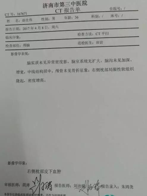 濟(jì)南市第三中醫(yī)院CT報(bào)告單顯示,趙先生右側(cè)枕部局限性軟組織隆起,密度增高。趙先生的同事周先生對(duì)記者說(shuō):“看著朋友被打成這樣,我心里很過(guò)意不去,所以我現(xiàn)在到醫(yī)院照顧他。”