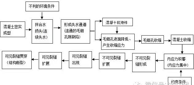 作者在攪拌站成立之初的抗裂實(shí)踐中,對這些現(xiàn)象也深感困惑。直到后來明確了早期裂縫是因?yàn)榛炷潦^多所致,并對這一機(jī)理進(jìn)行了深入研究,才重新認(rèn)識(shí)了混凝土收縮裂縫形成的全過程,如圖1[5]所示。