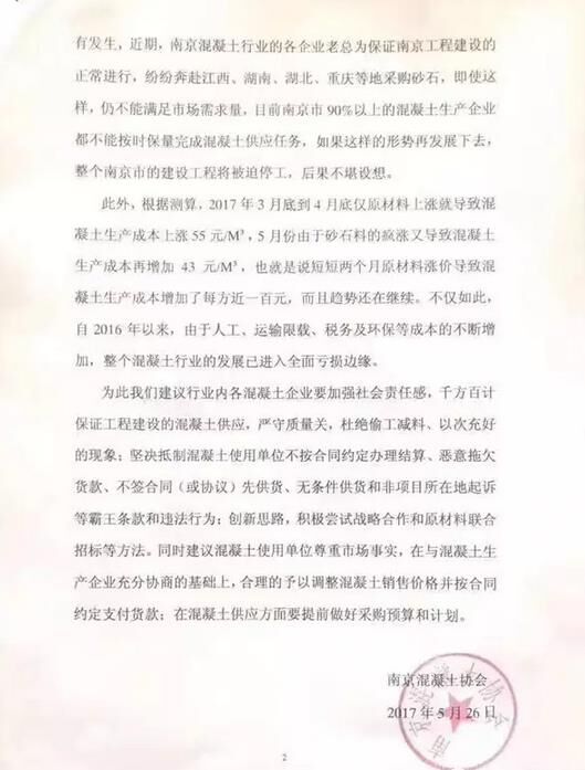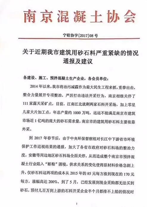 5月26日,南京混凝土協(xié)會(huì)關(guān)于近期南京市建筑用砂石料嚴(yán)重緊缺的情況發(fā)布通報(bào)及建議。公告中提到:目前江南江北僅剩的兩家石料開采場遠(yuǎn)遠(yuǎn)不能滿足南京市建筑市場近1億噸的砂石需求量,全市建筑用砂石料主要依靠外采。尤其是在今年春節(jié)以后,中央環(huán)保督察組對(duì)長江中下游省市環(huán)境保護(hù)巡視結(jié)果的通報(bào),加大了各省市政府對(duì)砂石料場的整治力度,周邊地區(qū)砂石料場全面關(guān)停,從而造成全市預(yù)拌混凝土行業(yè)陷入“斷糧”的困境,這也直接導(dǎo)致原材料價(jià)格急劇上升。