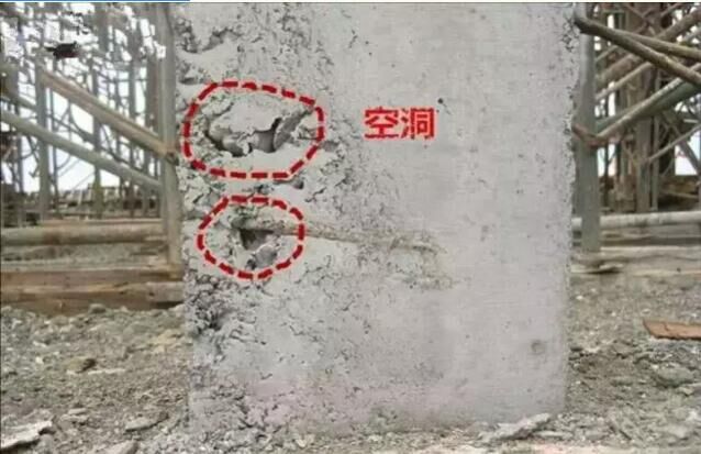 由于混凝土灌注時有一些部位堵塞不通,構件中就會產(chǎn)生空洞,空洞不同與蜂窩,蜂窩的特征是存在于未搗實的混凝土或缺水泥漿;而空洞卻是局部或全部沒有混凝土。空洞的尺度通常較大,以至于鋼筋全部裸露,造成構件內(nèi)貫通的斷缺以至于結構發(fā)生整體性破壞。