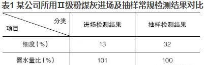 優(yōu)質(zhì)的粉煤灰摻入混凝土可明顯地改善混凝土的和易性,當(dāng)粉煤灰摻量大于膠材總量的5%~10%時(shí),效果極為明顯。現(xiàn)今在混凝土實(shí)際生產(chǎn)中,粉煤灰摻量往往達(dá)到20%,有的甚至高達(dá)30%,但混凝土的和易性卻不盡人意。抽取原材料進(jìn)行檢測(cè)時(shí),發(fā)現(xiàn)粉煤灰的檢測(cè)結(jié)果經(jīng)常不滿足標(biāo)準(zhǔn)要求或者與驗(yàn)收時(shí)的結(jié)果相差甚遠(yuǎn)。現(xiàn)以某公司所用Ⅱ級(jí)粉煤灰進(jìn)場(chǎng)及抽樣常規(guī)檢測(cè)結(jié)果進(jìn)行對(duì)比,見表1。