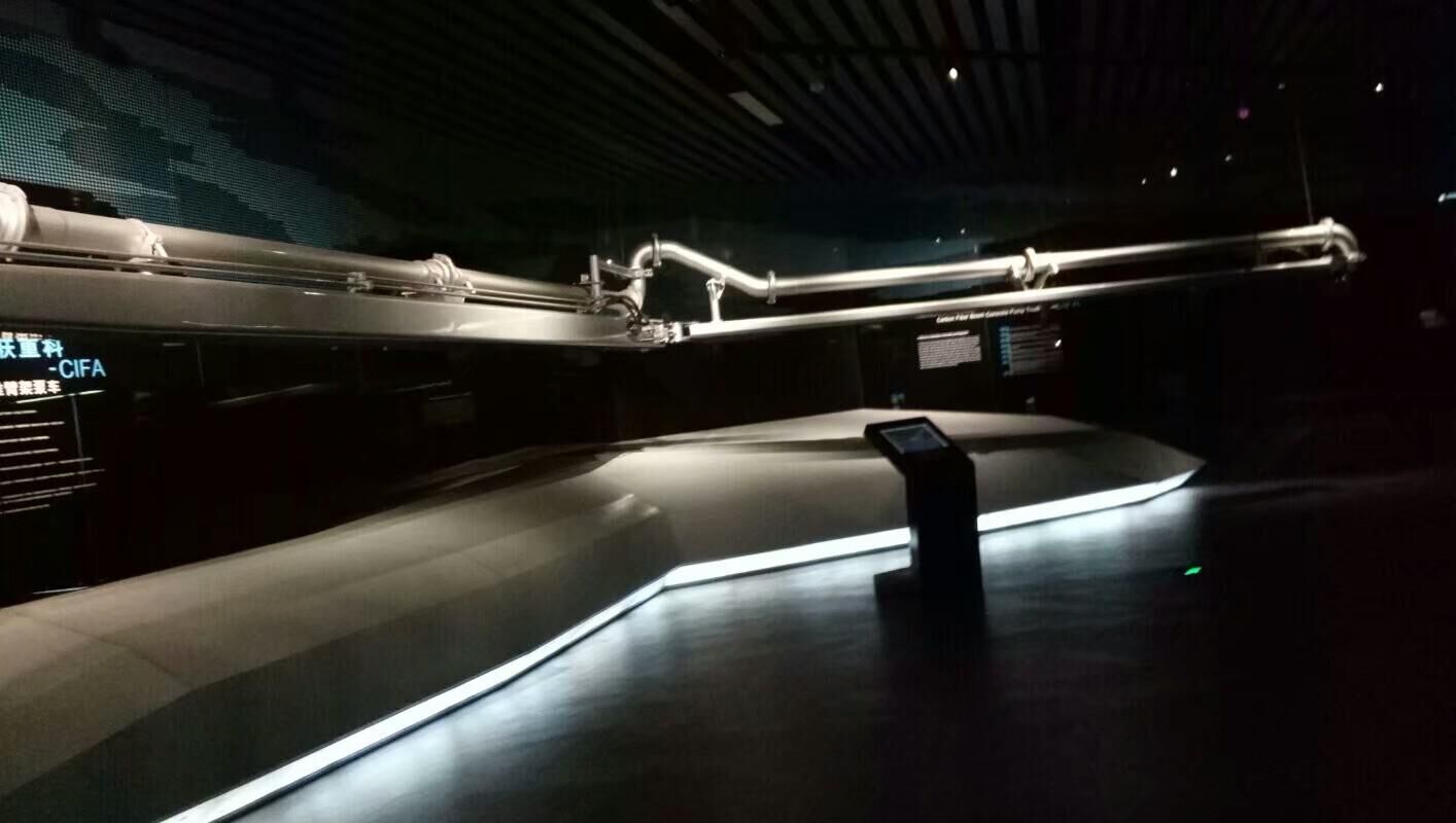 引導(dǎo)人員還特別向我們介紹了中聯(lián)的科技產(chǎn)品——碳釬維臂架,相比較鋼鐵材質(zhì)的臂架,同樣大小體積的臂架,碳纖維臂架只有傳統(tǒng)臂架五分之一的重量,完美的解決了臂架長度問題,這一產(chǎn)品的出世,展示了中聯(lián)在技術(shù)方面不斷的鉆研和追求。