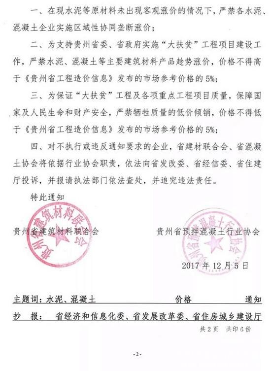 12月5日,貴州省建筑材料聯(lián)合會和貴州省預(yù)拌混凝土行業(yè)協(xié)會聯(lián)合發(fā)文《關(guān)于響應(yīng)和支持貴州省實(shí)施“大扶貧”戰(zhàn)略攻堅(jiān)階段的工作精神,嚴(yán)禁水泥、混凝土等主要建材產(chǎn)品嚴(yán)重高于<貴州省工程造價(jià)信息>市場參考價(jià)格銷售的通知》(黔協(xié)聯(lián)通字〔2017〕08號)(下文稱為《通知》)。