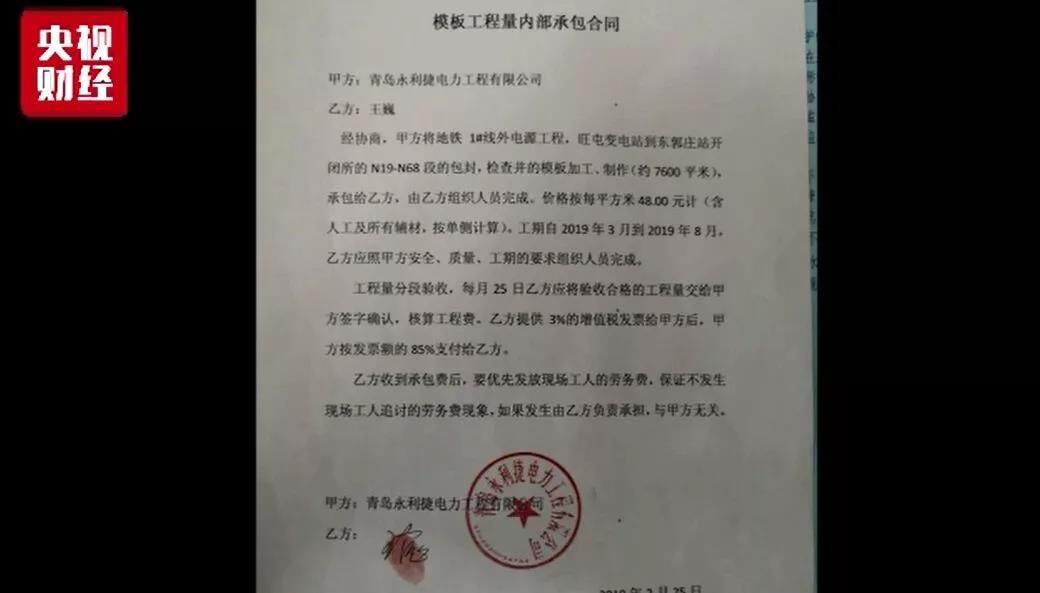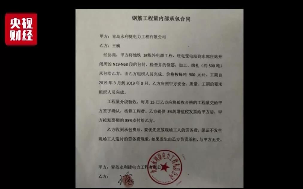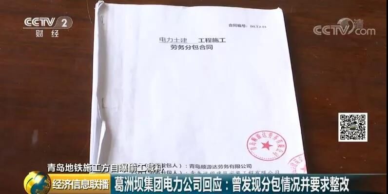 從青島地鐵到爆料人,一個總額1.4億元的地鐵配套項(xiàng)目工程,歷經(jīng)永利捷、順源達(dá)等多家公司分包、以及多位“中間人”轉(zhuǎn)手。其中環(huán)節(jié)到底有沒有涉嫌違法?央視記者走訪了青島地鐵集團(tuán)和葛洲壩電力公司。