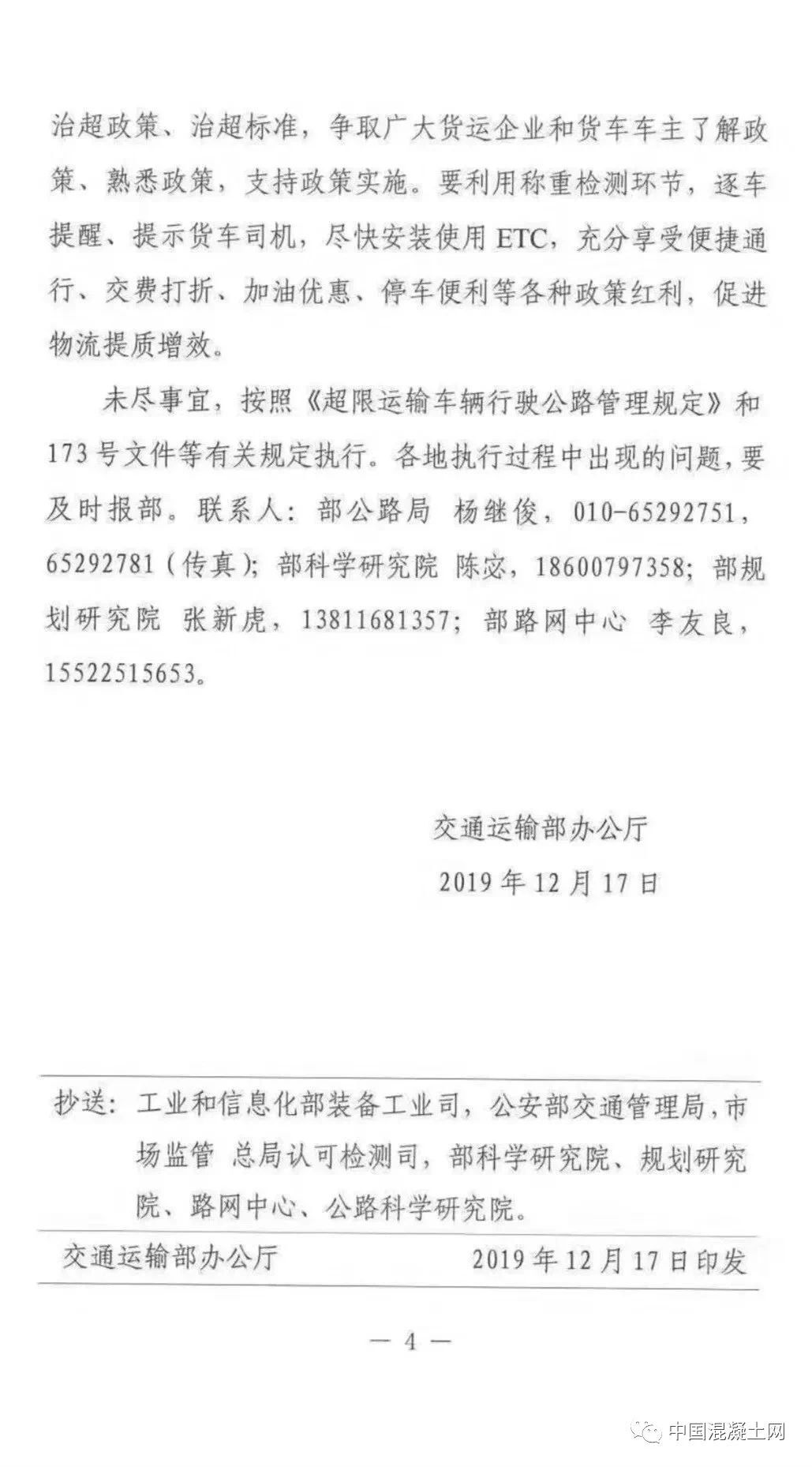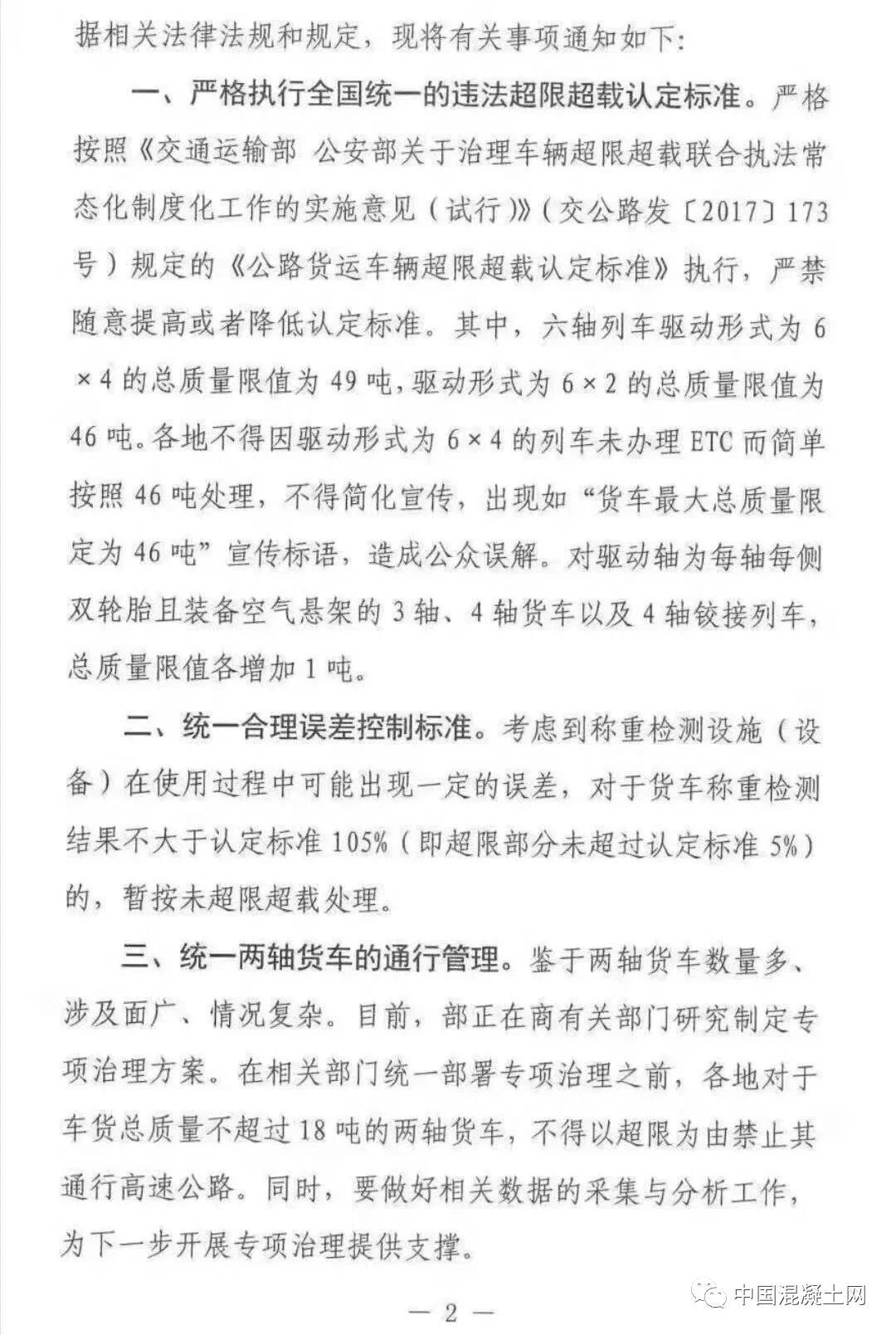 一、嚴(yán)格執(zhí)行全國(guó)統(tǒng)一的違法超限超載認(rèn)定標(biāo)準(zhǔn)。嚴(yán)格按照《交通運(yùn)輸部 公安部關(guān)于治理車輛超限超開車聯(lián)合執(zhí)法常態(tài)化制度化工作的實(shí)施意見 (試行)》(交公路發(fā)【2017】173號(hào))規(guī)定的《公路貨運(yùn)車輛超限超載認(rèn)定標(biāo)準(zhǔn)》執(zhí)行,嚴(yán)禁隨意提高或者降低認(rèn)定標(biāo)準(zhǔn)。其中,六軸列車驅(qū)動(dòng)形式為6×4的總質(zhì)量限值為49噸,驅(qū)動(dòng)形式為6×2的總質(zhì)量限值為46噸。各地不得因驅(qū)動(dòng)形式為6×4人列車未辦理ETC而簡(jiǎn)單按照46噸處理,不得簡(jiǎn)化宣傳,出現(xiàn)如“貨車最大總質(zhì)量限定為46噸”宣傳標(biāo)語,造成公眾誤解。對(duì)驅(qū)動(dòng)軸為每軸每則雙輪胎且裝備空氣懸架的3軸、車軸貨車以及4軸鉸接列車總質(zhì)量限值各增加1噸。二、統(tǒng)一合理誤差控制標(biāo)準(zhǔn)。考慮到稱重檢測(cè)設(shè)施(設(shè)備)在使用過程中可能出現(xiàn)一定的誤差,對(duì)于貨車稱重檢測(cè)結(jié)果不大于認(rèn)定標(biāo)準(zhǔn)105%(即超限部分未直如過認(rèn)定標(biāo)準(zhǔn)的5%)的,暫按未超限超載處理。鑒于兩軸貨車數(shù)量多、涉及面廣、情況復(fù)雜。目前,部正在商有關(guān)部門研究制定專項(xiàng)治理方案。在相關(guān)部門統(tǒng)一部署專項(xiàng)治理之前,各地對(duì)于車貨總質(zhì)量不超過18噸的兩軸貨車,不得以超限為由禁止其通行高速公路。同時(shí),要做好相關(guān)數(shù)據(jù)的采集與分析工作,為下一步開展專項(xiàng)治理提供支撐。《交通運(yùn)輸部辦公室廳關(guān)于進(jìn)一步規(guī)范高速公路入口治超工作的通知》(交辦公路【2019】29號(hào))中所提的“貨車必檢,超限禁入”中,“超限”特指車貨總質(zhì)量違法超限行為;對(duì)已辦理《超限運(yùn)輸車輛通行證》的合法大件運(yùn)輸致車輛,應(yīng)允許其通行高速公路,并做好相關(guān)服務(wù)保障工作。根據(jù)《交通運(yùn)輸部 公安部關(guān)于治理車輛超限超載聯(lián)合執(zhí)法常態(tài)化制度化工作的實(shí)施意見(試行)》(交公路發(fā)【2017】173號(hào))部署,目前重點(diǎn)對(duì)車貨總質(zhì)量進(jìn)行稱重檢測(cè)。對(duì)于車貨外廓尺寸超限行為,將按照國(guó)家有關(guān)部門的統(tǒng)一部署,分階段、有步驟推進(jìn);在部署工作開展前,高速公路入口暫不對(duì)車貨外廓尺寸進(jìn)行檢測(cè)。對(duì)車輛運(yùn)輸超限標(biāo)準(zhǔn)的認(rèn)定,按照《交通運(yùn)輸 部辦公室廳 公安部辦公室廳 工業(yè)和信息化部辦公室廳關(guān)于深入推進(jìn)車輛運(yùn)輸車治理工作的通知》(交辦運(yùn)【2018】702號(hào))有關(guān)要求執(zhí)行,對(duì)于合規(guī)車輛運(yùn)輸車,凡裝載符合要求的,即平頭鉸接列車裝載6輛及以下,長(zhǎng)頭鉸接列車裝載7輛及以下,中置軸車輛運(yùn)輸車裝載9輛及以下,且裝載長(zhǎng)度、寬度未超過車輛運(yùn)輸車外廓尺寸限值的,暫不對(duì)車輛高度進(jìn)行檢測(cè)。組織公路執(zhí)法機(jī)構(gòu)和高速公路經(jīng)營(yíng)管理單位,通過媒體宣傳、懸掛標(biāo)語和橫幅、散發(fā)傳單等多種方式,大力宣傳高速公路入口稱重檢測(cè)政策,重點(diǎn)宣傳此項(xiàng)工作對(duì)保護(hù) 人民群眾生命財(cái)產(chǎn)安全的重大意義 ,宣傳解讀治超政策、治超標(biāo)準(zhǔn),爭(zhēng)取廣大貨運(yùn)企業(yè)和貨車車主了解政策、熟悉政策,支持政策實(shí)施。要利用稱重檢測(cè)環(huán)節(jié),逐車提醒、提示貨車司機(jī),盡快安裝ETC,充分享受便捷通行、交費(fèi)打折、加油優(yōu)惠、車便利等各種政策紅利,促進(jìn)物流提質(zhì)增效。未盡事宜,按照《超限運(yùn)輸車輛行駛公路管理規(guī)定》和173號(hào)文件等有關(guān)規(guī)定執(zhí)行。各地執(zhí)行過程中出現(xiàn)的要及時(shí)報(bào)部。全國(guó)物流標(biāo)準(zhǔn)非?;靵y,地方標(biāo)準(zhǔn)與國(guó)家標(biāo)準(zhǔn)經(jīng)常“打架”,導(dǎo)致全國(guó)物流司機(jī)苦不堪言,而此次交通廳像各省運(yùn)輸廳發(fā)布特急文件通知,劍指就是統(tǒng)一運(yùn)輸車輛載重的標(biāo)準(zhǔn),令運(yùn)輸行業(yè)向制度化,規(guī)范化過渡。同時(shí)從根源上徹底清除“亂收費(fèi)”現(xiàn)象,并發(fā)布問題反映電話:部科學(xué)研究院:陳宓 18600797358部規(guī)劃院:張新虎 13811681357部路網(wǎng)中心:李友良 15522515653