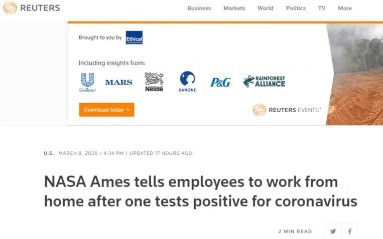 據(jù)路透社3月9日?qǐng)?bào)道,美國(guó)國(guó)家航空航天局(NASA)位于加利福尼亞州的艾姆斯研究中心3月8日發(fā)表聲明稱,該中心一員工新冠病毒檢測(cè)呈陽性。出于謹(jǐn)慎考慮,該中心要求其他員工在家工作,直到另行通知。