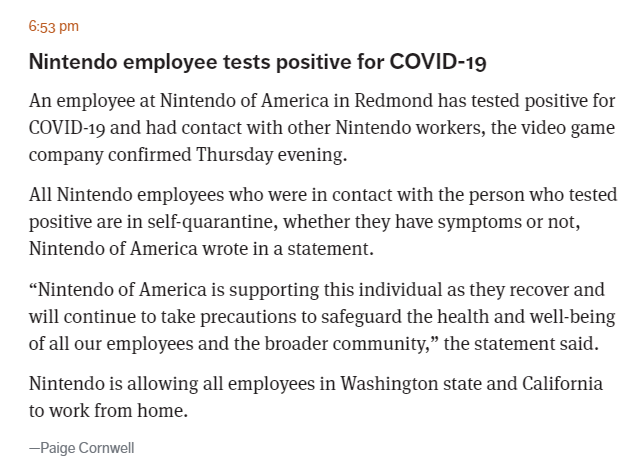 根據(jù)《西雅圖時(shí)報(bào)》的相關(guān)報(bào)道,美國(guó)任天堂一名員工目前已經(jīng)出現(xiàn)“新冠病毒檢測(cè)陽性”的狀況,目前,與這位員工有過接觸的其他人員已經(jīng)開始自我隔離。《西雅圖時(shí)報(bào)》報(bào)道原文: