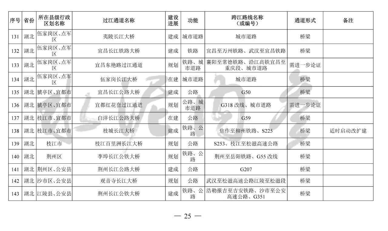 湖北省(24座):巴東長江公路二橋、興山至長陽高速公路過江通道、宜昌東艷路過江通道、宜都紅花套過江通道、枝江百里洲長江大橋、李埠長江公鐵大橋、觀音寺長江大橋、武漢都市區(qū)環(huán)線漢南過江通道、軍山長江二橋、武漢軌道17號線過江通道(青菱過江通道)、武漢白沙洲過江通道、武漢軌道12號線白沙洲過江通道、武漢軌道11號線三期漢陽段過江通道、武漢軌道13號線過江通道(小東門過江通道)、二七路過江通道、武漢軌道10號線二七過江通道、武漢軌道12號線丹水池過江通道、堤角過江通道、武漢軌道20號線過江通道、武漢軌道25號線過江通道(長江新城過江通道)、武漢軌道新港線陽邏過江通道、光谷過江通道、新港高速雙柳長江大橋、鄂黃第二過江通道鄂湘界(1座):監(jiān)利至華容公鐵兩用大橋