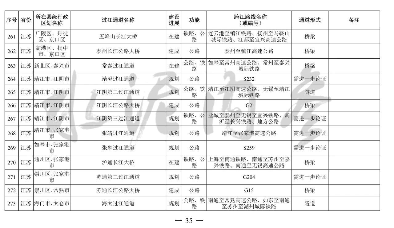 江蘇?。?3座):錦文路過江通道、南京地鐵4號線過江通道、南京市域快速軌道過江通道、南京上元門過江通道、南京七鄉(xiāng)河過江通道、龍?zhí)堕L江大橋、寧儀城際鐵路過江通道、潤揚(yáng)第二過江通道、江陰第二過江通道、江陰第三過江通道、張皋過江通道、蘇通第二過江通道、海太過江通道