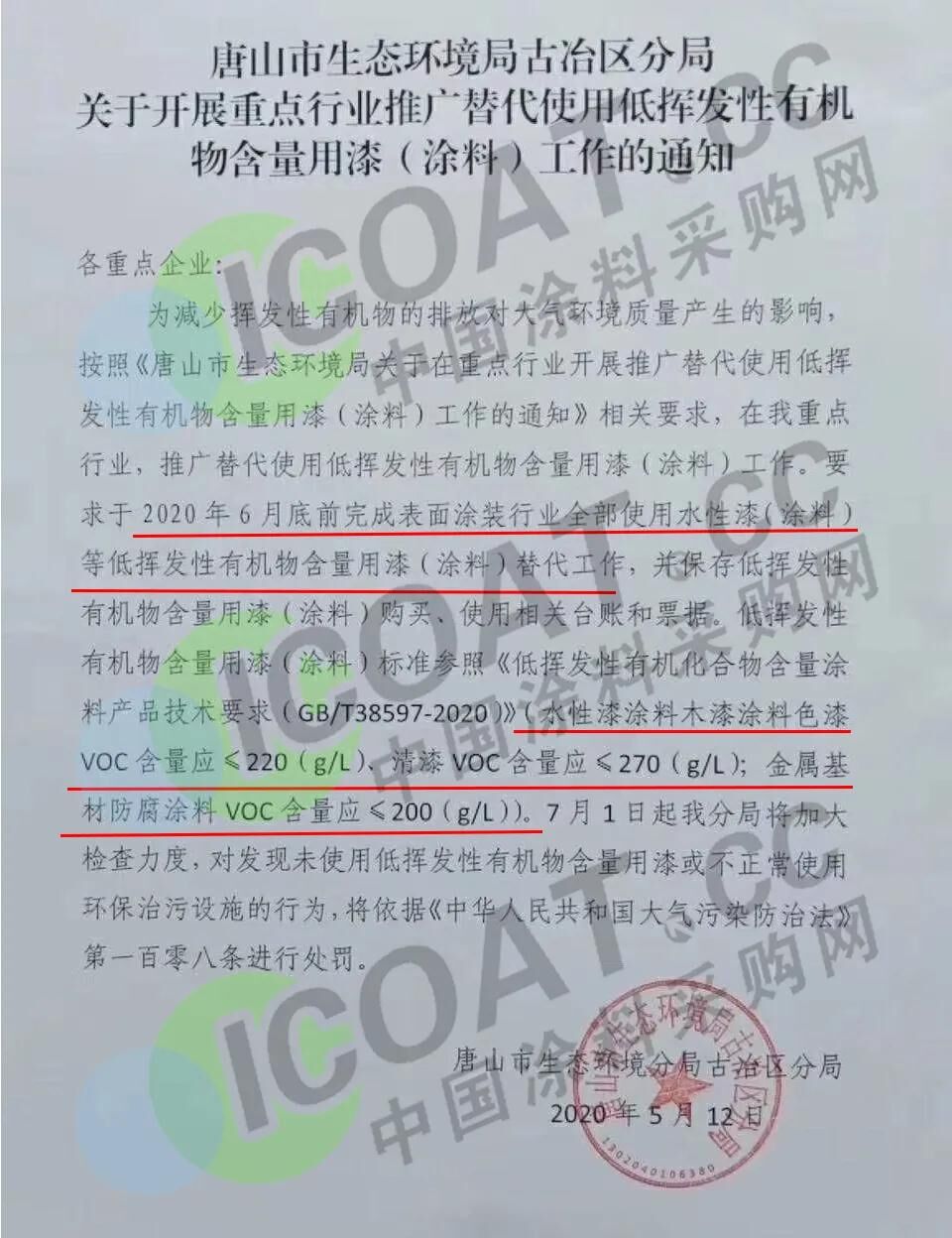 摘要:近幾年,涂料行業(yè)的“油改水”做的轟轟烈烈,全國各地也陸續(xù)出臺很多支持政策,但是總是雷聲大雨點小,很多政策模棱兩可,讓從業(yè)者無所適從,而近日河北唐山市生態(tài)環(huán)境局古冶區(qū)分局發(fā)布了一則重要通知,明確了使用水性漆的截止日期,并同步了處罰依據,為水性涂料行業(yè)打入一劑強心劑。通知如下: