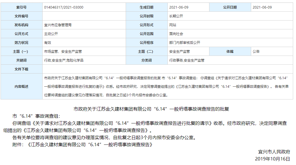 2021年6月9日,江蘇省宜興市人民政府官網(wǎng)發(fā)布《關(guān)于江蘇金久建材集團有限公司“6.14”一般坍塌事故調(diào)查報告的批復(fù)》,對一起因筒庫坍塌造成2死1傷的事故進行通報。