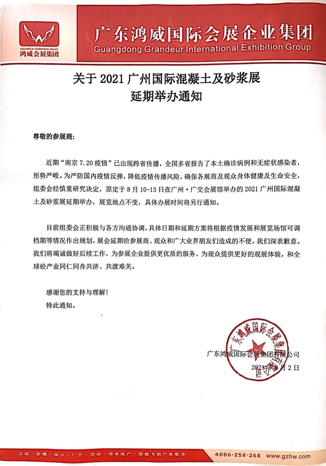 由于當(dāng)前國內(nèi)多地出現(xiàn)新型冠狀病毒肺炎新增確診病例、中高風(fēng)險地區(qū)不斷增加的疫情嚴峻形勢影響,為全力配合做好疫情防控工作,避免大規(guī)模聚集和降低疫情傳播風(fēng)險,保障參展商、觀眾及工作人員健康安全,維護參展單位權(quán)益,確保展會效果,組委會經(jīng)慎重研究決定,原定于8月10-13日在廣州·廣交會展館舉辦的2021廣州國際混凝土及砂漿展延期舉辦,展覽地點不變,具體辦展時間將另行通知。