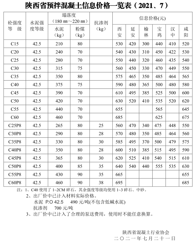 陜西省預(yù)拌混凝土信息價格一覽表(2021.7)