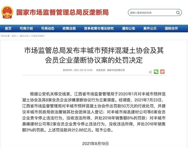 8月18日,國家市場監(jiān)管總局發(fā)布通報,江西省市場監(jiān)督管理局對豐城市預(yù)拌混凝土協(xié)會及其會員企業(yè)壟斷協(xié)議一案,合計罰沒約2.86億元。