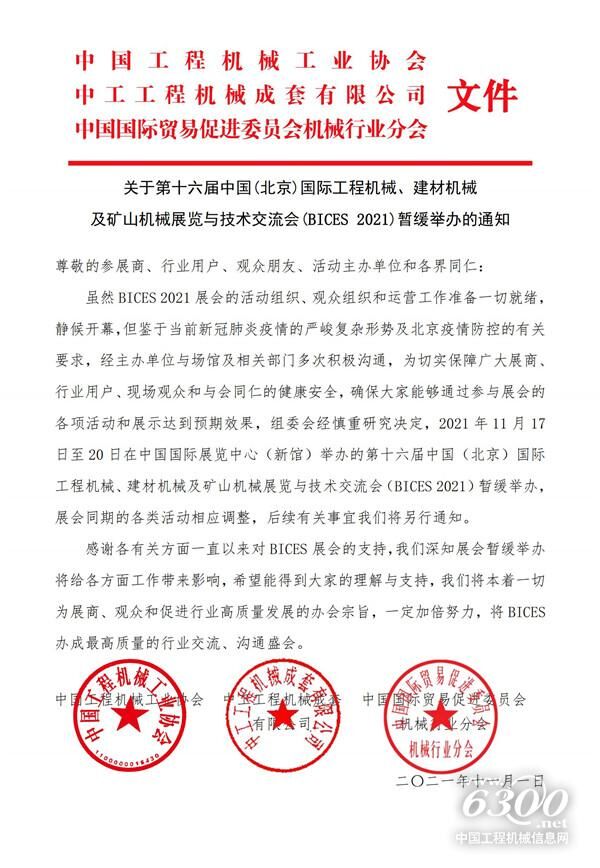 BICES 2021組委會(huì)于2021年11月1日下午下發(fā)了關(guān)于第十六屆中國(北京)國際工程機(jī)械、建材機(jī)械及礦山機(jī)械展覽與技術(shù)交流會(huì)(BICES 2021)暫緩舉辦的通知,延期時(shí)間未定。