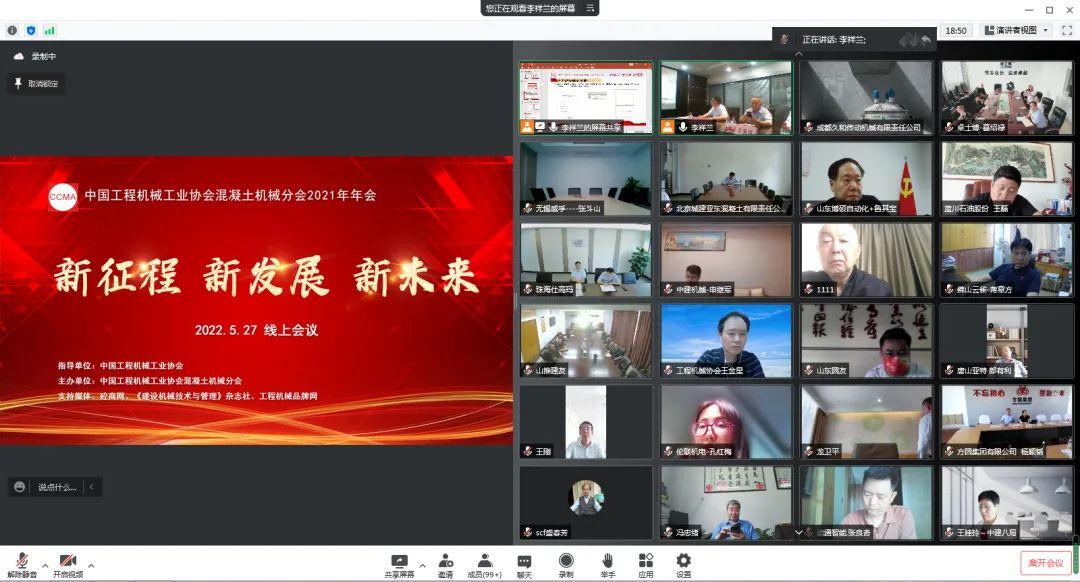 2022年5月27日,以“新征程 新發(fā)展 新未來 ”為主題的中國工程機(jī)械工業(yè)協(xié)會混凝土機(jī)械分會年會在線上隆重召開。中國工程機(jī)械工業(yè)協(xié)會會長蘇子孟、名譽(yù)會長祁俊、協(xié)會顧問龍國鍵、副秘書長呂瑩、副秘書長王金星、副秘書長尹曉荔、其他分支機(jī)構(gòu)領(lǐng)導(dǎo)、混凝土機(jī)械分會會長符忠軒、名譽(yù)會長盛春芳、秘書長李祥蘭、顧問易君、分會秘書處、分會理事及會員單位相關(guān)負(fù)責(zé)人、行業(yè)上下游企業(yè)與行業(yè)專家等在內(nèi)的兩百余人參與此次會議。