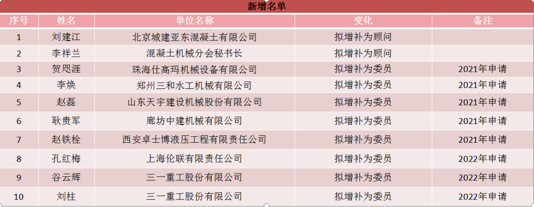 2022年4月29日經(jīng)混凝土機(jī)械分會理事會決議,團(tuán)標(biāo)委員增補(bǔ)10人,變更2人,取消2人。委員人數(shù)由31人調(diào)整至39人。