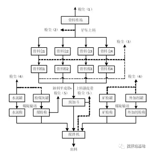 混凝土生產過程中主要粉塵分布及形成如下圖所示: