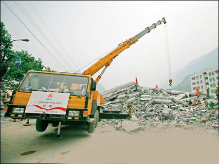 三一7臺挖掘機、8臺起重機以及80多名具有設備操作經(jīng)驗的青年員工組成抗震救災志愿者突出隊,受命開赴災區(qū)。