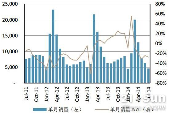 瑞銀表示,行業(yè)整體景氣度并未好轉(zhuǎn),下滑之勢未改。2013年4月開始,土方機(jī)械單月銷量增速由負(fù)轉(zhuǎn)正,其中挖機(jī)銷量在2013年四季度實(shí)現(xiàn)了超過20%的增長,裝載機(jī)在8月后亦實(shí)現(xiàn)了超過15%的月均銷量增長。但進(jìn)入2014年以來,由于房地產(chǎn)銷售及新開工不佳,2014年3月,挖掘機(jī)和裝載機(jī)銷量分別下滑8%和4%,結(jié)束了11個月的正增長。此后4-7月,跌幅持續(xù)擴(kuò)大,其中7月挖機(jī)銷量下降27%,裝載機(jī)銷量下滑20%。