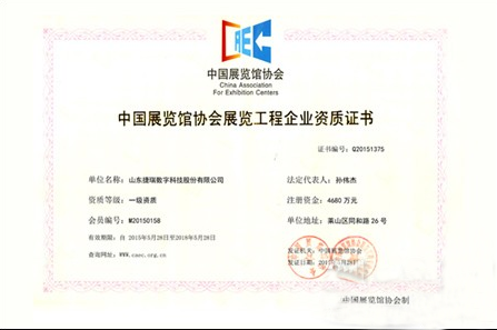 2015年5月28日,山東捷瑞數(shù)字科技股份有限公司順利通過中國展覽館協(xié)會的審核,正式被認(rèn)定為中國展覽展示行業(yè)最高資質(zhì):展覽工程企業(yè)一級資質(zhì),并獲得中國展覽館協(xié)會頒發(fā)的資質(zhì)證書。