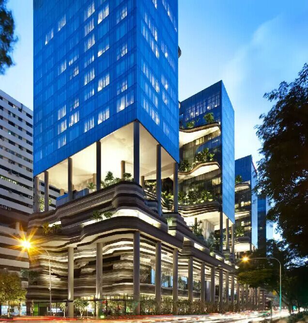酒店位于其中心商業(yè)區(qū),是新加坡WOHA建筑事務所的杰作,負責景觀設計的為Tierra事務所。皮克林賓樂雅采用花園酒店理念,貫徹節(jié)能,已獲新加坡綠色建築最高榮譽BCA綠色建築白金獎,因其為首間使用太陽能酒店,獲得太陽能先鋒獎。酒店樓高16層,12層高的塔樓坐落在5層高裙樓樓頂上,塔樓每隔三層懸挑一座空中花園。裙樓被波狀預制混凝土包圍,WOHA稱之為地形建筑、會呼吸的建筑。