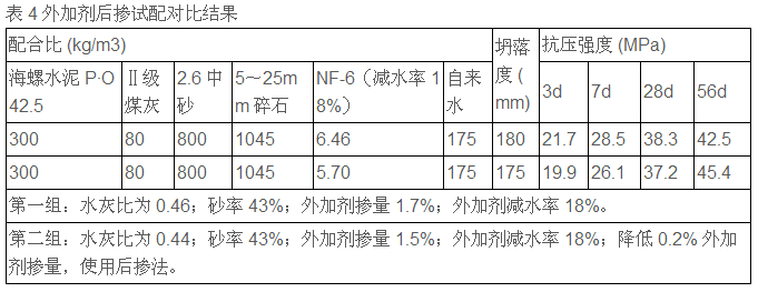 試配對比結(jié)果分析:其他材料相同,使用高效減水劑(NF-1),保持砂率及外加劑摻量不變,適當(dāng)降低水泥用量及用水量,使水灰比降低,在相同的坍落度下28d 及 56d 強度相近并降低了成本。