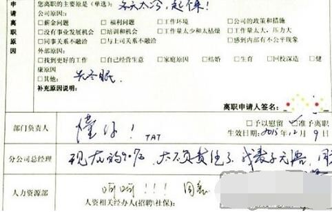 部門(mén)負(fù)責(zé)人回復(fù):“懂你,TAT”;分公司總經(jīng)理回復(fù):“現(xiàn)在的90后,太不負(fù)責(zé)任了,我表示無(wú)語(yǔ)。同意”;人力資源部回復(fù):“呵呵?。。⊥狻?。