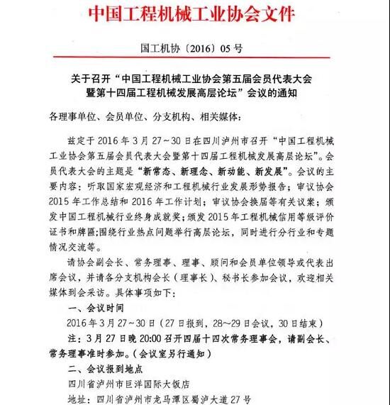 茲定于2016年3月27~30日在四川瀘州市召開(kāi)“中國(guó)工程機(jī)械工業(yè)協(xié)會(huì)第五屆會(huì)員代表大會(huì)暨第十四屆工程機(jī)械發(fā)展高層論壇”。會(huì)員代表大會(huì)的主題是“新常態(tài)、新理念、新動(dòng)能、新發(fā)展”。會(huì)議的主要內(nèi)容:聽(tīng)取國(guó)家宏觀經(jīng)濟(jì)和工程機(jī)械行業(yè)發(fā)展形勢(shì)報(bào)告;審議協(xié)會(huì)2015年工作總結(jié)和2016年工作計(jì)劃;審議協(xié)會(huì)換屆等有關(guān)議案;頒發(fā)中國(guó)工程機(jī)械行業(yè)終身成就獎(jiǎng);頒發(fā)2015年工程機(jī)械信用等級(jí)評(píng)價(jià)證書(shū)和牌匾;圍繞行業(yè)熱點(diǎn)問(wèn)題舉行高層論壇,同時(shí)進(jìn)行分行業(yè)和專(zhuān)題情況交流等。