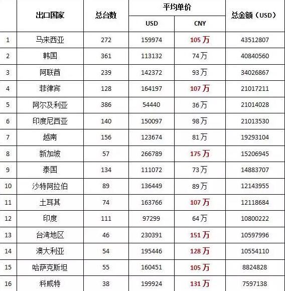 2015年1—11月我國塔機出口3098臺,同比減少14.68%,出口金額達到39303.24萬美元,同比減少6.95%,預計全年出口3300臺左右,相比國內市場接近50%的銷量跌幅,塔機出口成績可嘉。尤其2015年上半年相比去年同期增長了16.7%,但從7月份開始逐月走低。從近10年的區(qū)域占比來看,中國塔機出口的市場一直由亞太地區(qū)市場占據絕對主力,從近三年的數據可以看出,雖然歷年各國排名都有變化,但除了俄羅斯聯(lián)邦、土耳其、巴西、阿爾及利亞等國家外,其他列于榜單中的國家全部位于亞洲區(qū)域,顯而易見,我國塔機出口主要市場依舊是亞洲等發(fā)展中國家。(具體參見下圖:2015年1—11月塔機出口數據)
