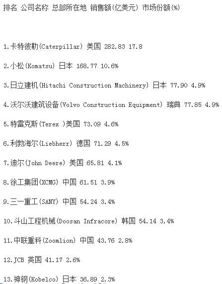 分析指出,受大宗商品價格下跌、新型經(jīng)濟體經(jīng)濟增速減緩和世界經(jīng)濟不景氣的影響,全球前50家工程機械制造企業(yè)總產(chǎn)值較上一年度下跌16.2%,達到1330億美元,創(chuàng)2009年以來新低。據(jù)中國工程機械商貿網(wǎng)編輯了解,2009年,工程機械行業(yè)一年銷售額下降了1090億美元。自那時起,工程機械行業(yè)收入下降趨勢一直未有改變。報告同時強調,榜單上下滑最為嚴重的是中國企業(yè),這很大程度上是因為中國經(jīng)濟增速的放緩。中國企業(yè)中,只有徐工集團仍然保持在前十強,位列榜單第九位。“這個市場趨勢表現(xiàn)最顯著的就是中國建筑設備制造商,相比去年,所有中國企業(yè)的排名有所下滑。排名前十的企業(yè)中,如今只有徐工一家中國工程機械制造廠商?!?/span>