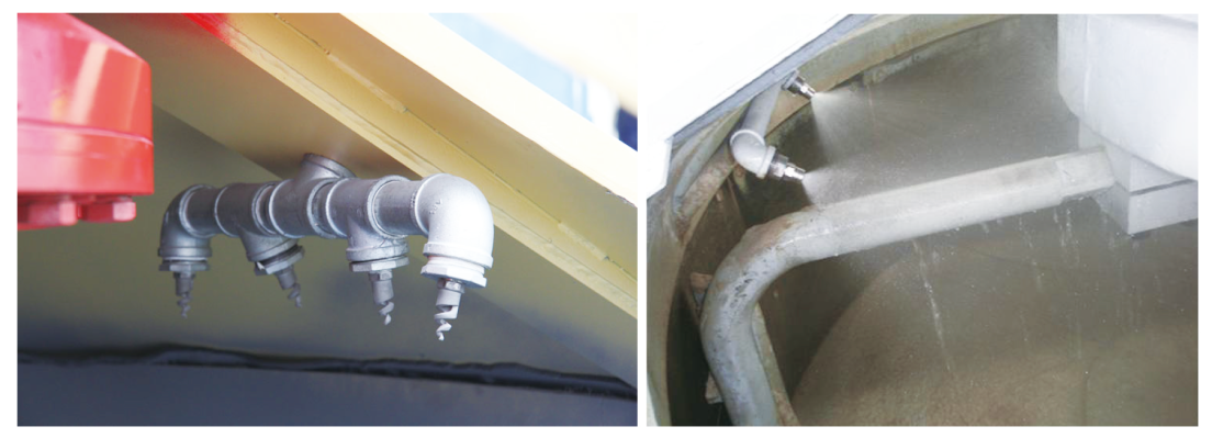 水路采用上置式結(jié)構(gòu)(專利產(chǎn)品),解決管路中殘余外加劑和水的現(xiàn)象,避免可客戶換配方時造成損失。噴頭采用螺旋形實(shí)心圓錐形噴嘴,具有細(xì)密均勻的霧化效果,覆蓋面積大,使物料攪拌均勻。