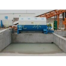 該系統(tǒng)主要由:攪拌車加水清洗裝置,溜槽輸送裝置,砂石漿水分離裝置,和泥漿水后處理裝置組成?;炷凛斔驮O備清洗后,將殘余混凝土排入溜槽中,在高壓水流沖擊下,經溜槽進入砂石分離機,在不斷旋轉的分離機作用下,對混凝土進行充分的清洗,同時將砂、石進行分離,分離后的砂、石在導料葉片的作用下背向流動,再通過提升式出料口排出分離機,分別堆放。清洗后的漿水從分離機的底部排出進入沉淀池逐級沉淀后循環(huán)使用或進入攪拌池回收利用。進入攪拌池(一般情況2個攪拌池)的漿水為了防止沉淀凝固,需通過攪拌器的作用,攪拌器的工作為間歇式。分離出水泥漿在連續(xù)的攪拌器作用下,再通過高壓污水泵輸送到攪拌樓中待生產計量再利用。整個控制系統(tǒng)設有手動和自動控制,方便控制設置,整個系統(tǒng)運行可靠,故障率低,維護量少等特點。