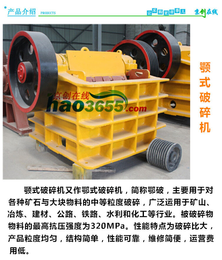 顎式破碎機在礦山、建材、基建等部門主要用作粗碎機和中碎機。按照進料口寬度大小來分為大、中、小型三種,進料口寬度大于600MM的為大型機器,進料口寬度在300-600MM的為中型機,進料口寬度小于300MM的為小型機。顎式破碎機結構簡單,制造容易,工作可靠,使用維修方便。