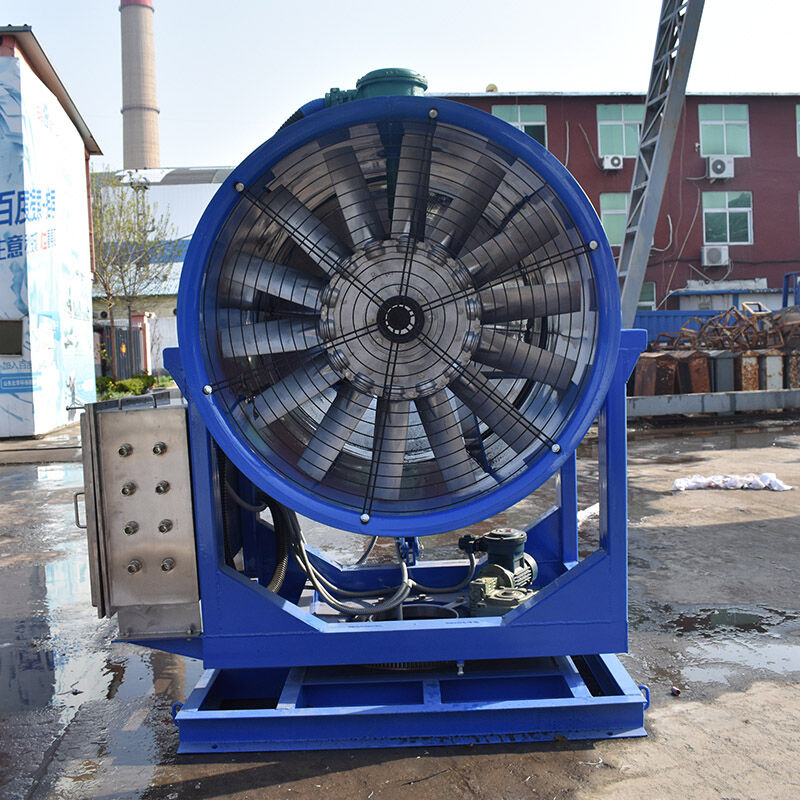 合理放置在鋼材焊接的主體框架內(nèi),最下部是輪胎。霧炮機工作時高壓泵將水加壓通過風(fēng)筒前部的噴霧噴頭霧化,風(fēng)機風(fēng)筒出風(fēng)將水霧擴散到需要揚塵控制的區(qū)域,使水霧與粉塵顆粒充分接觸、碰撞、結(jié)合變成大顆粒團聚從而自然沉降,