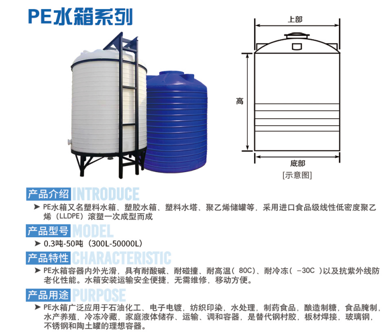 產(chǎn)品由進(jìn)口滾塑料(PE)生產(chǎn)的PE儲罐,食品級,耐酸堿,防腐蝕,強度好。