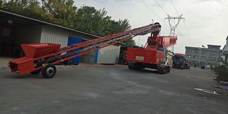 首先將布料桁架放下,在桁架前端用安全凳墊好;依次拆下附件(油管、電氣)、上料膠帶機、主機受料斗、配重、油缸、布料膠帶機、三角支架等。