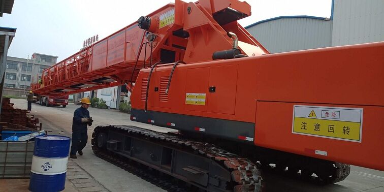 我公司生產(chǎn)的可移動式混凝土運輸、澆筑設備——自行帶式混凝土布料機,小時澆筑強度可達270m3。為了解決混凝土布料機的供料問題,自行研制了可移動式上料平臺。