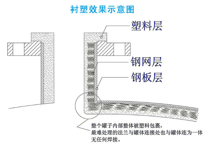 鋼襯塑聚乙烯儲(chǔ)罐:以純聚乙烯(PE)為原料,使用熱融滾塑工藝將聚乙烯內(nèi)襯于鋼罐體內(nèi)壁,鋼罐體內(nèi)網(wǎng)(龜甲)與聚乙烯有機(jī)結(jié)合成一體,使聚乙烯牢固過(guò)渡連接鋼體內(nèi)表面,內(nèi)襯聚乙烯防腐層厚度可根據(jù)實(shí)際需要而定,內(nèi)襯聚乙烯防腐層厚度可在15-25mm不等。