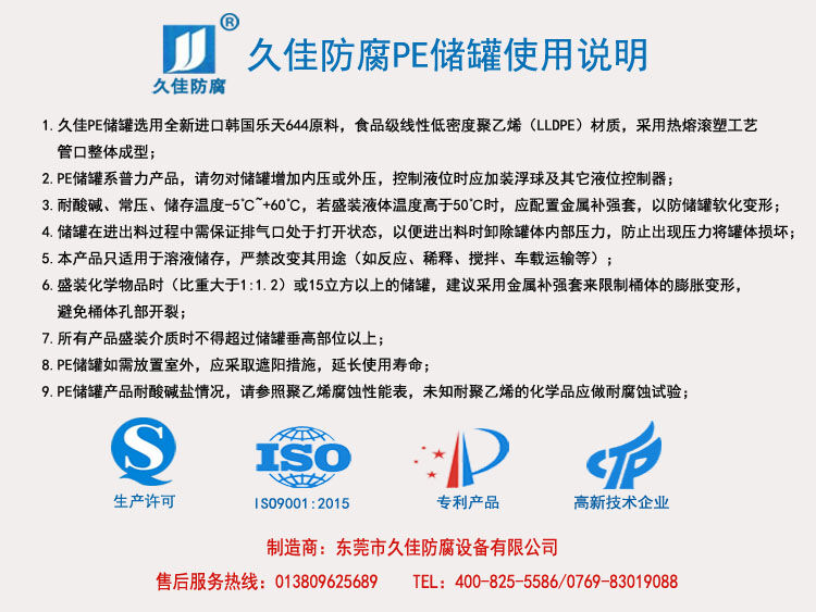 2、久佳儲(chǔ)罐采用進(jìn)口韓國進(jìn)口644線性低密度(LLDPE)原料,韌性和強(qiáng)度均優(yōu)于其他原料,符合中國食品衛(wèi)生檢測標(biāo)準(zhǔn)??商峁┖细褡C、檢測報(bào)告等文件