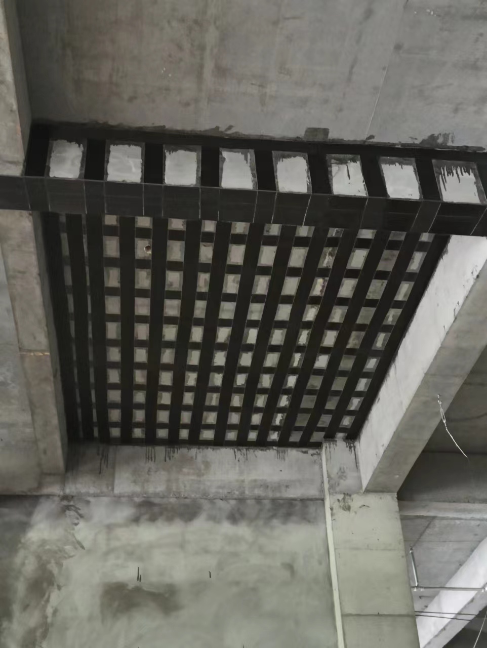 5.粘貼碳纖維:應按設計要求裁剪碳纖維,不得損壞橫向織物面,涂抹粘結膠應均勻,敷貼碳纖維應平整無氣泡。