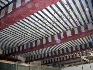 5.粘貼碳纖維:按設計要求的尺寸裁剪碳纖維,將配制后的粘結膠均勻涂抹粘貼部位的混凝土表面上。將裁剪好的碳纖維敷設在涂好粘結膠的基礎上,并用滾筒沿碳纖維纖維方向多次滾壓使粘結膠充分浸透纖維中。