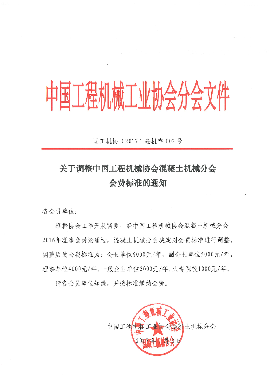 關(guān)于調(diào)整中國工程機械協(xié)會混凝土機械分會會費標(biāo)準的通知