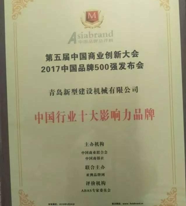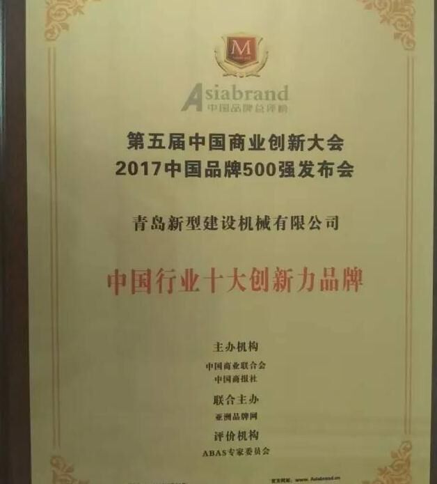 2017年5月31日,以“新品牌、新供給、新未來”為主題的第五屆中國商業(yè)創(chuàng)新大會暨2017中國品牌500強發(fā)布會在北京國家會議中心隆重舉行。建筑機械行業(yè)知名企業(yè)中青林集團旗下青島新型建設(shè)機械有限公司受邀參會,一舉榮獲“中國行業(yè)十大創(chuàng)新力品牌”與“中國行業(yè)十大影響力品牌”。