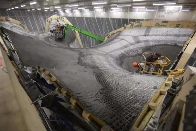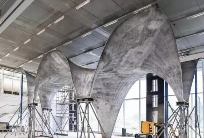 據(jù)了解,工程師們在打造過程中并沒有采用定制、一次性的木頭或泡沫支架,而是使用了他們自己設計的一種新技術。一張鋼索網(wǎng)被拉伸到想要的形狀,然后再在上面放置聚合織物形成一個靈活的模板。之后形狀可以通過算法控制,它能將力均勻地發(fā)布在各鋼索間并決定每個部分所需要的混凝土量。之后,鋼索網(wǎng)可以被拆掉、重復使用和重新調整。