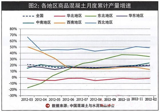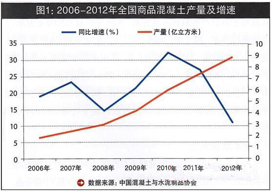 2012年前三季度,房地產(chǎn)調(diào)控和重點(diǎn)在建續(xù)建大型工程項(xiàng)目啟動緩慢,商品混凝土市場需求大幅下降,前三季度累計(jì)同比增長7.9%,到了第四季度增幅有所回升,最終全年增速在11%。